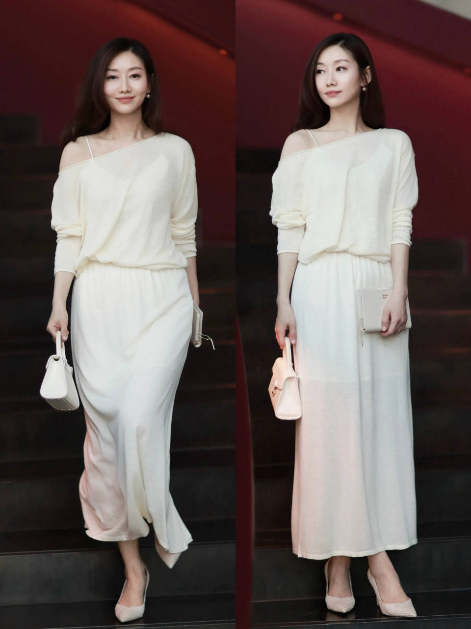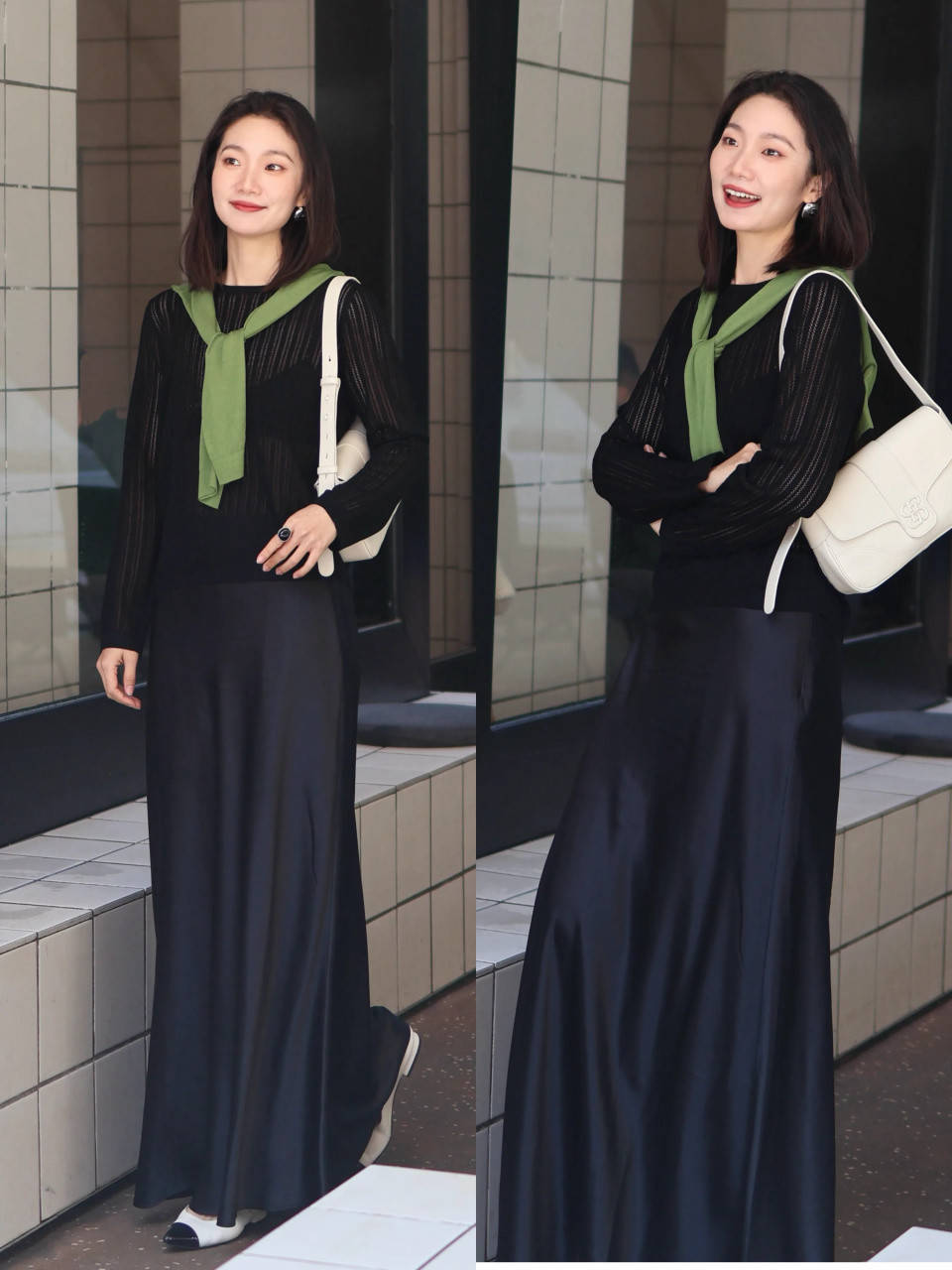 若思让我方的造型更权贵的情况下,我们在衣服的面料和面容上不错下点功夫,举例上头用真丝面料的垂坠感玄色直筒半裙搭配上半透明的玄色诚恳上衣,权贵又略带点小性感,拿执得恰到公正。