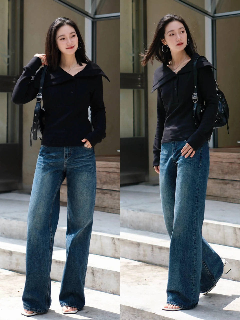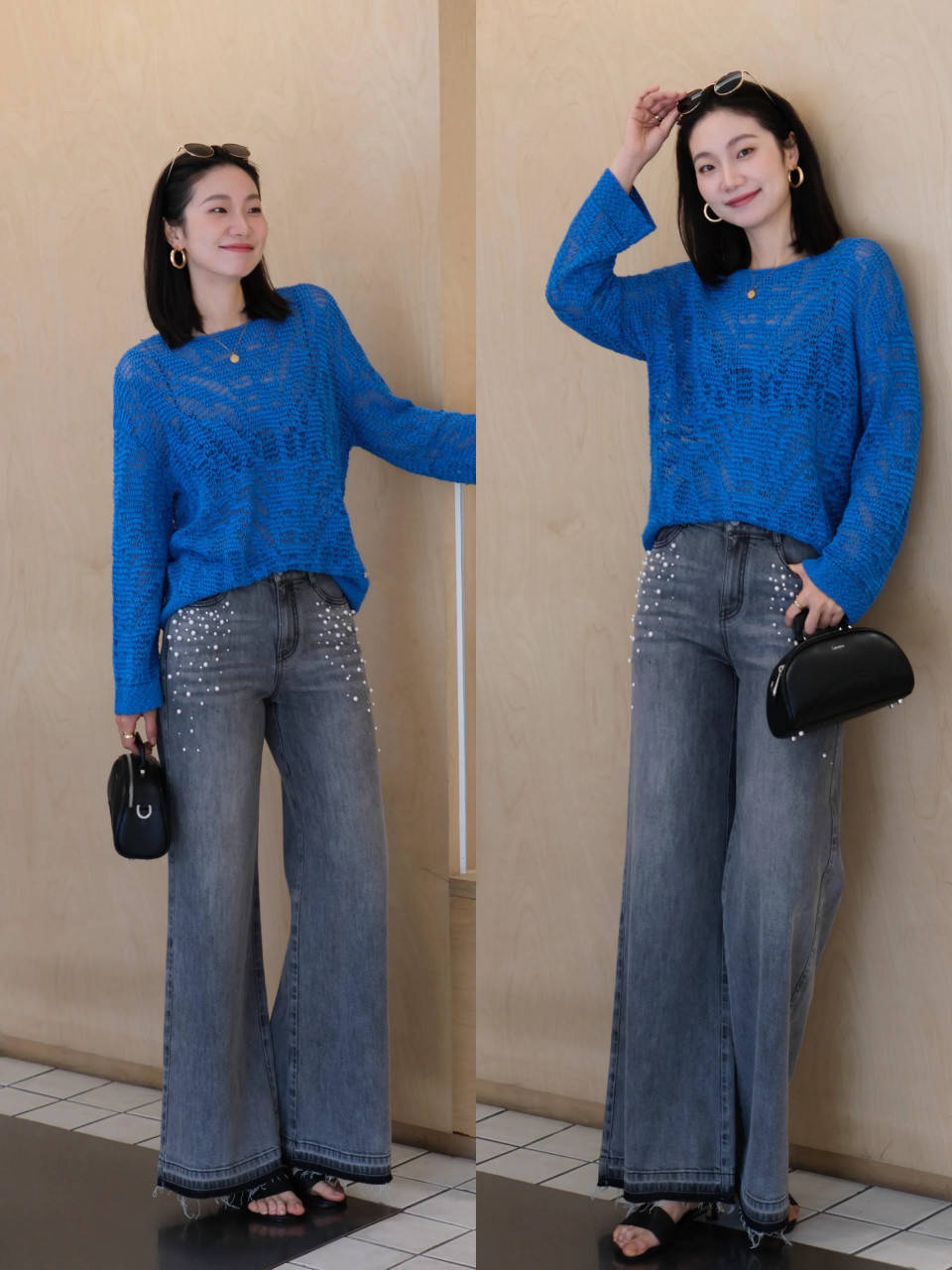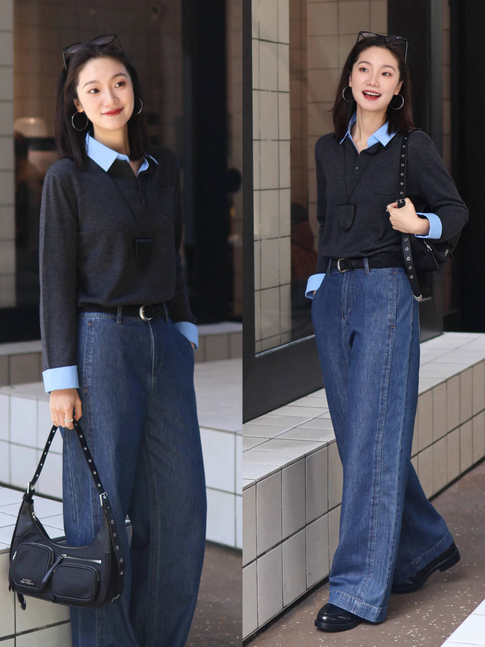 Tips②:蓝色镂空诚恳衫+灰色牛仔直筒阔腿裤