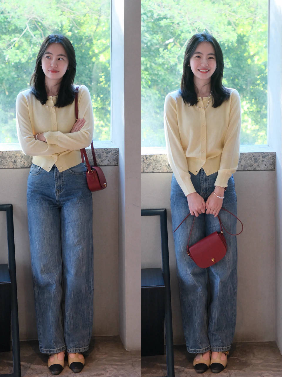 偏疼平日耐看的造型,可选拔浅鹅黄色诚恳开衫,搭配上蓝色的牛仔直筒裤,脚踩一对玄色与卡其色拼接的玛丽珍鞋,配色干净从简,适配大精深东谈主,不挑躯壳,不挑场景,松驰穿出松弛舒适感造型。