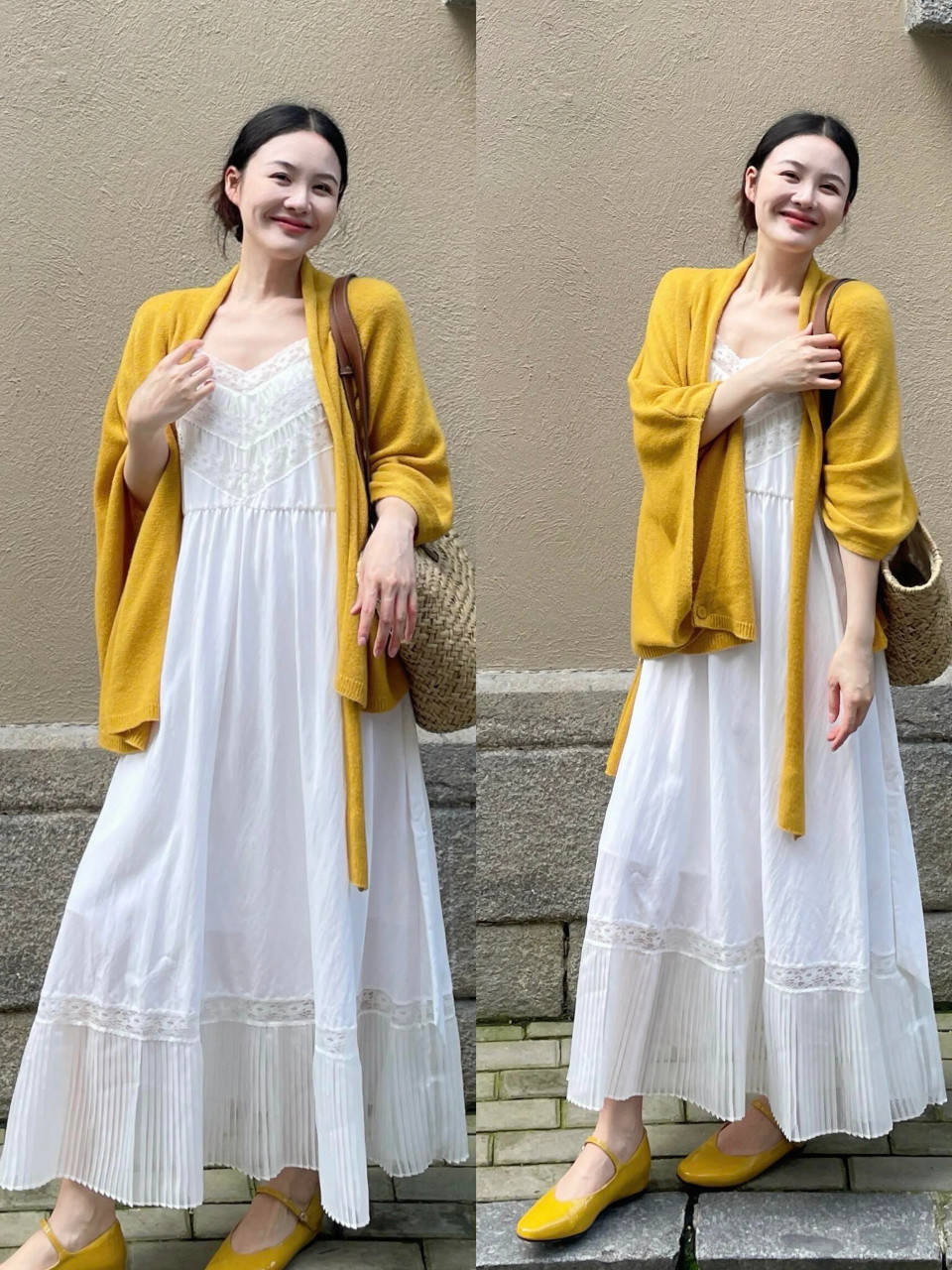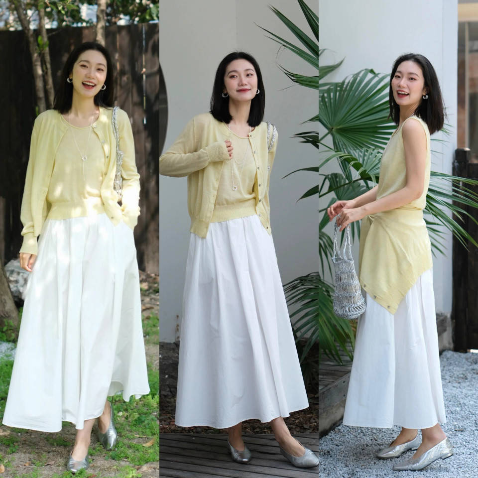 part②:浅鹅黄色诚恳开衫+白色伞裙,元气满满