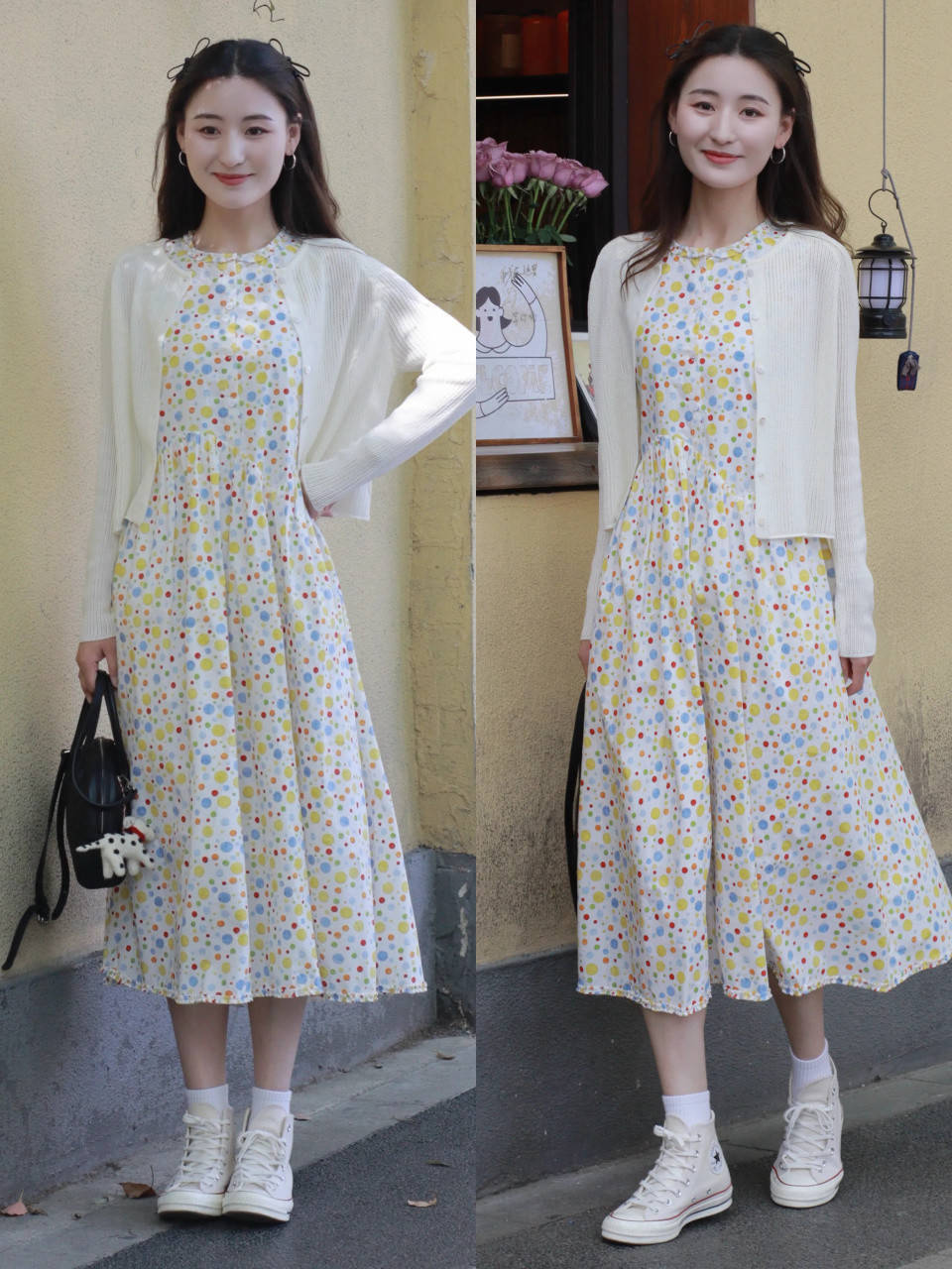淌若偏疼仙气飘飘的仙女气味,不错平直选拔一件白色的诚恳开衫,搭配上一条波点的连衣裙,脚踩一对帆布鞋,增强元气仙女气味,可盐可甜,让你松驰拿执。