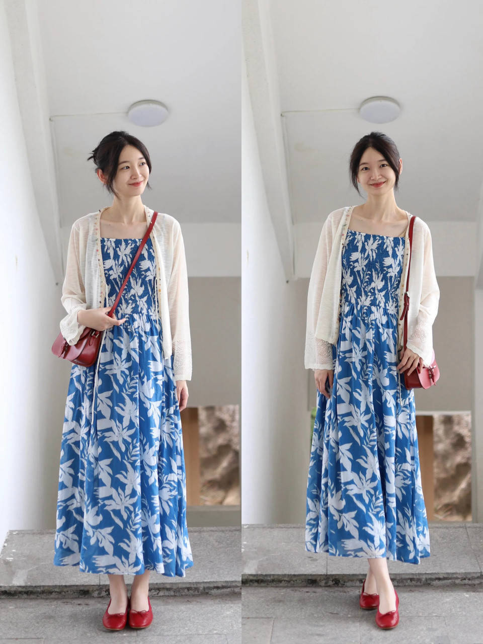 我们还不错选拔一件短款的白色诚恳开衫,搭配上一条印花的吊带连衣裙,脚踩红色玛丽珍鞋,外短内长的搭配决策,能使得我们的躯壳比例变得更结合。显高又显瘦。
