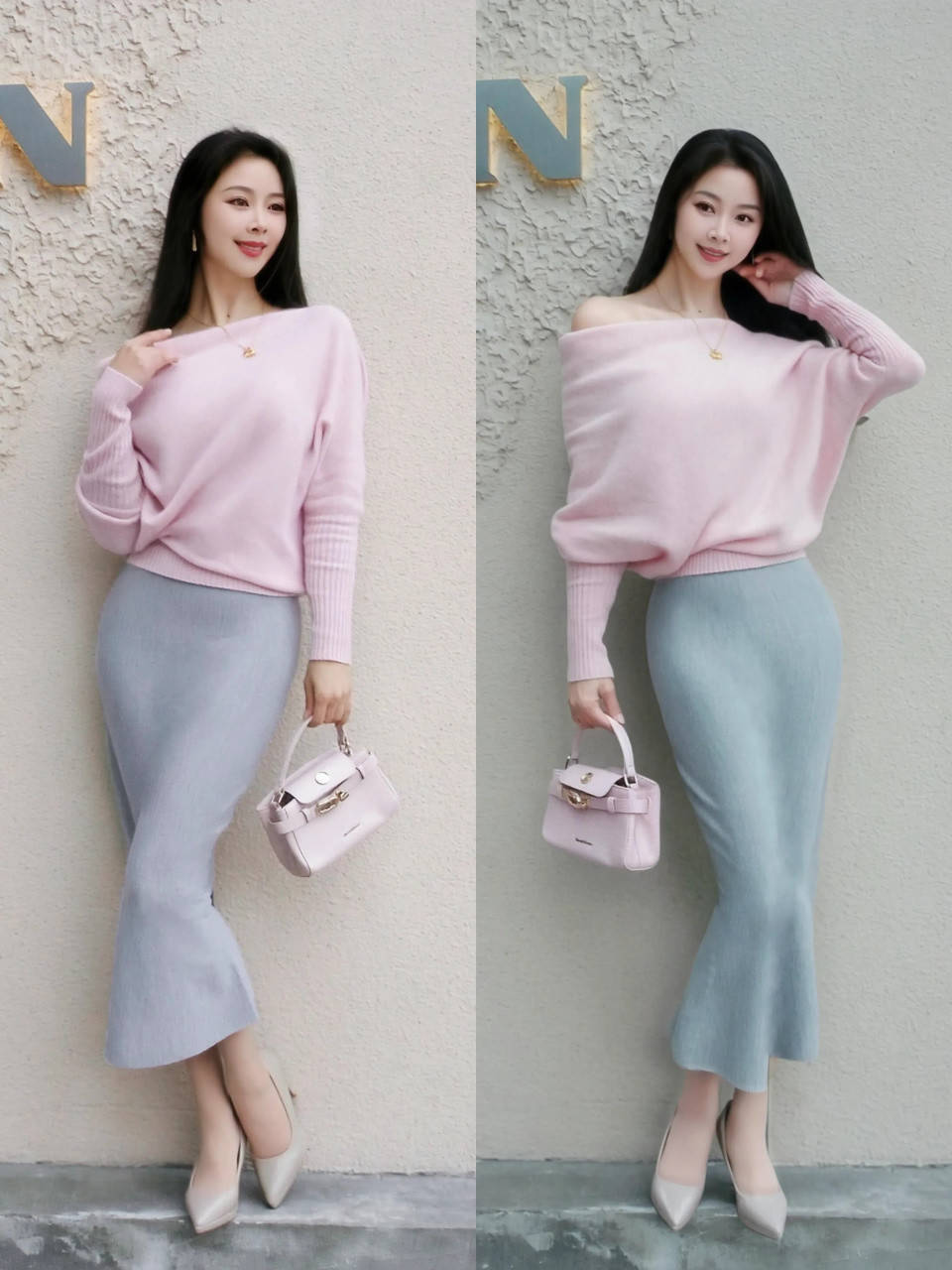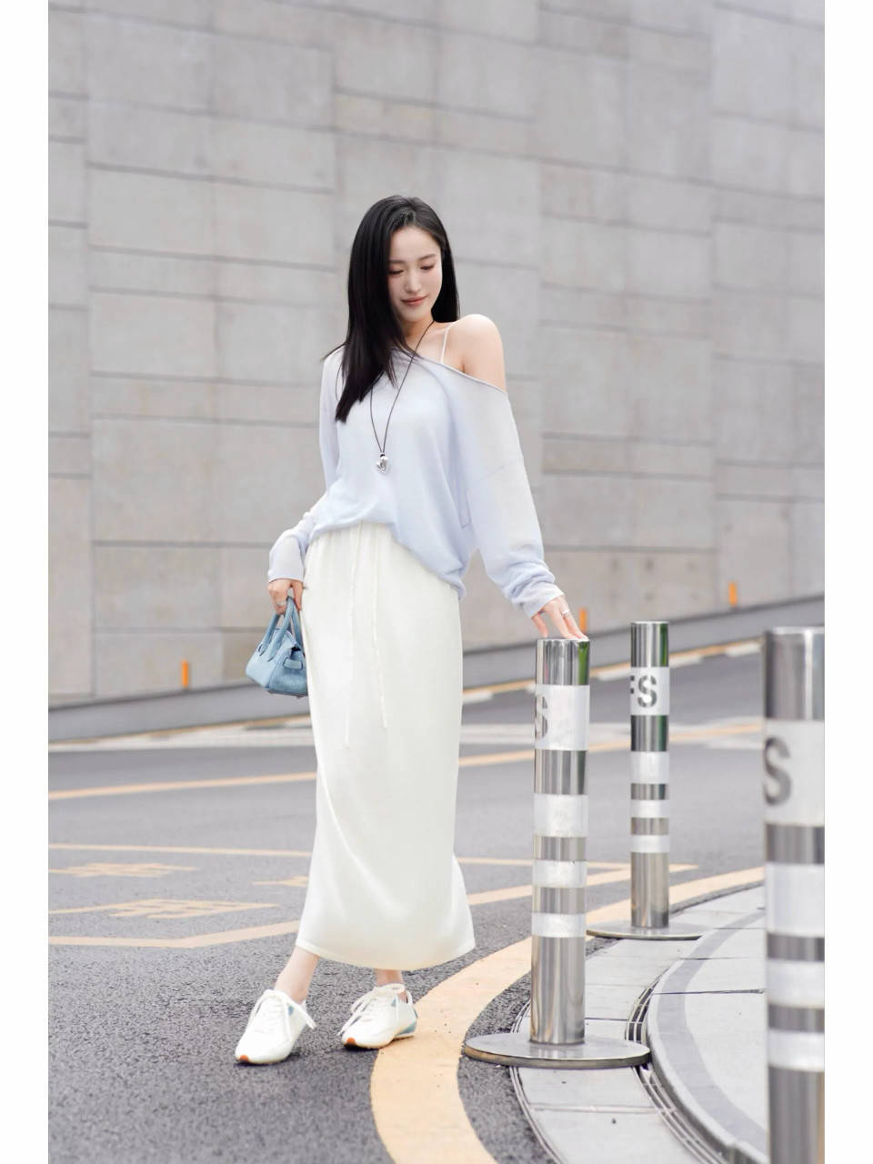 淌若偏疼和睦优雅感,可选一件一样是一字肩的淡蓝色上衣,配上一条白色的垂坠感直筒半身裙,脚踩一对白色的领会鞋,不奋勉不费时,让你松驰拿执春日的小性感造型。