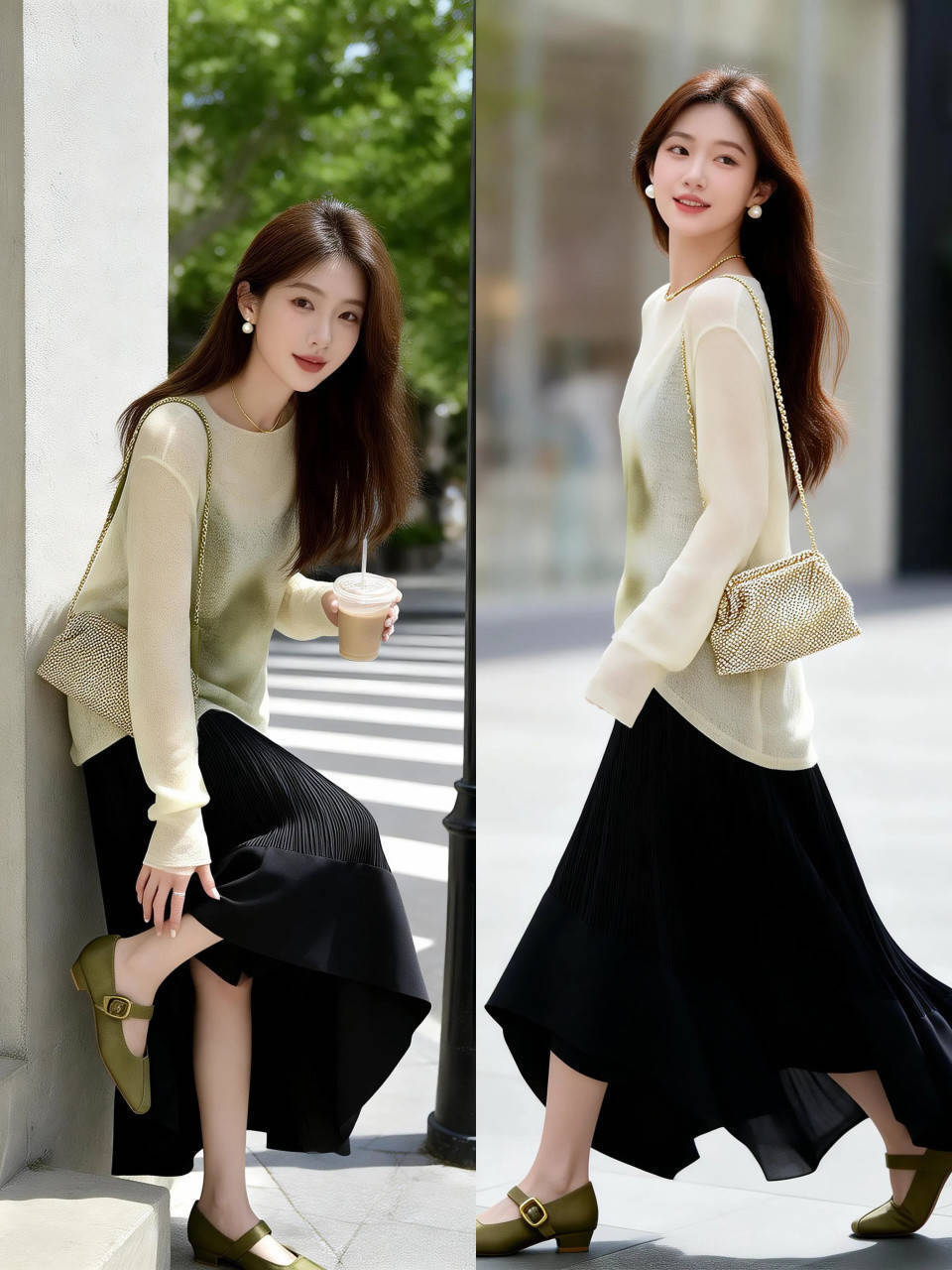 part①:透明太玄色诚恳衫搭配真丝面料半裙,立志典雅