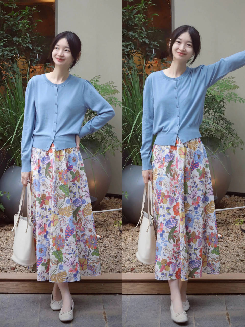 举例上头用一件蓝色的诚恳开衫搭配上一条印花的散装半裙,脚踩一对玛丽珍鞋,这样的穿衣打扮松驰突破千里闷与败兴,同期解决配色单调问题。