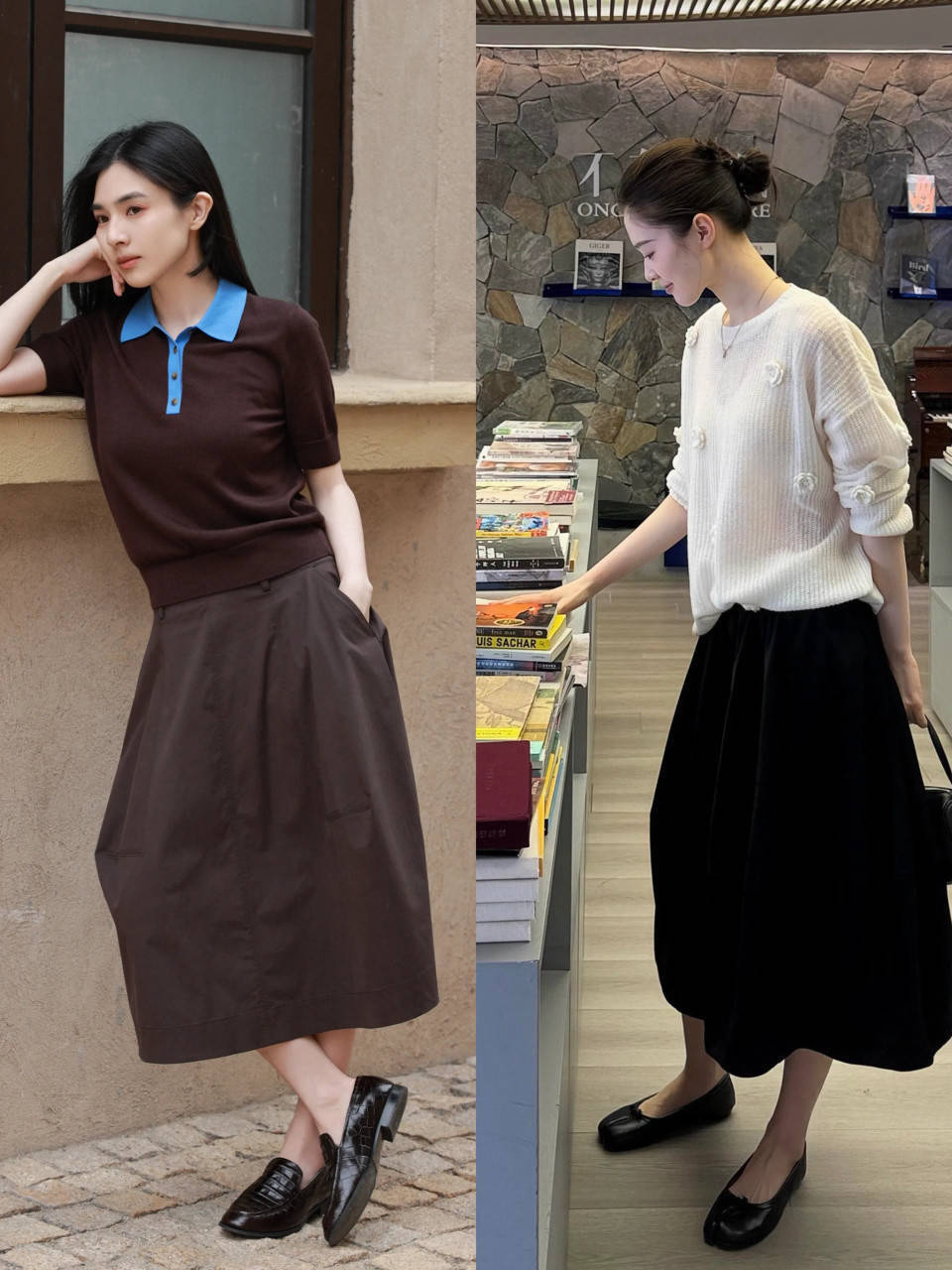 淌若我们选拔的是一件棕色的诚恳 polo 衫,搭配上棕色半裙,可选一对玄色的皮鞋或是乐福鞋来组合,更显气质。