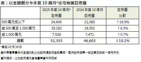 其他金额类别同比同时亦录升幅,当中逾500万至1,000万港元住宅物业录19,182宗注册,较前年同时的18,052宗加多约6.3%;而逾1,000万港元住宅物业录7,526宗注册,较前年同时的7,471宗则隐微加多约0.7%。